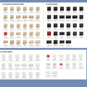 عصابة واحدة في اتجاهين, 2 عصابة 2 طريق, 3 عصابة 2 طريق, 4 عصابة 2 طريق, مفتاح دفع الجرس, مقبس 13 أمبير مع سويتش, مقبس 15 أمبير مع سويتش, مقبس MF مع سويتش, مقبس مزدوج 13 أمبير مع مفتاح, مقبس MF مزدوج مع مفتاح, مقبس كهربائي مزدوج مع منفذي USB, مقبس الهاتف, مقبس البيانات, مقبس هاتف مزدوج, مقبس الهاتف والبيانات, القمر الصناعي, مفتاح الإضاءة الخافتة 1000 واط, مفتاح سخان الماء 20 أمبير, مفتاح تيار متردد 45 أمبير, طبق فارغ 3*3, طبق فارغ 3*6, مقبس بيانات مزدوج, وحدة التحكم في السرعة, منفذ 25 أمبير, طباخ 45 أمبير ومقبس 13 أمبير, مقبس MF واحد مع منفذي USB, وحدة تحفيز 13 أمبير مع مفتاح, 45 منفذًا (كيلو طن) |