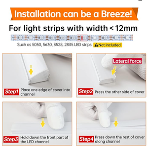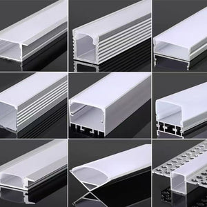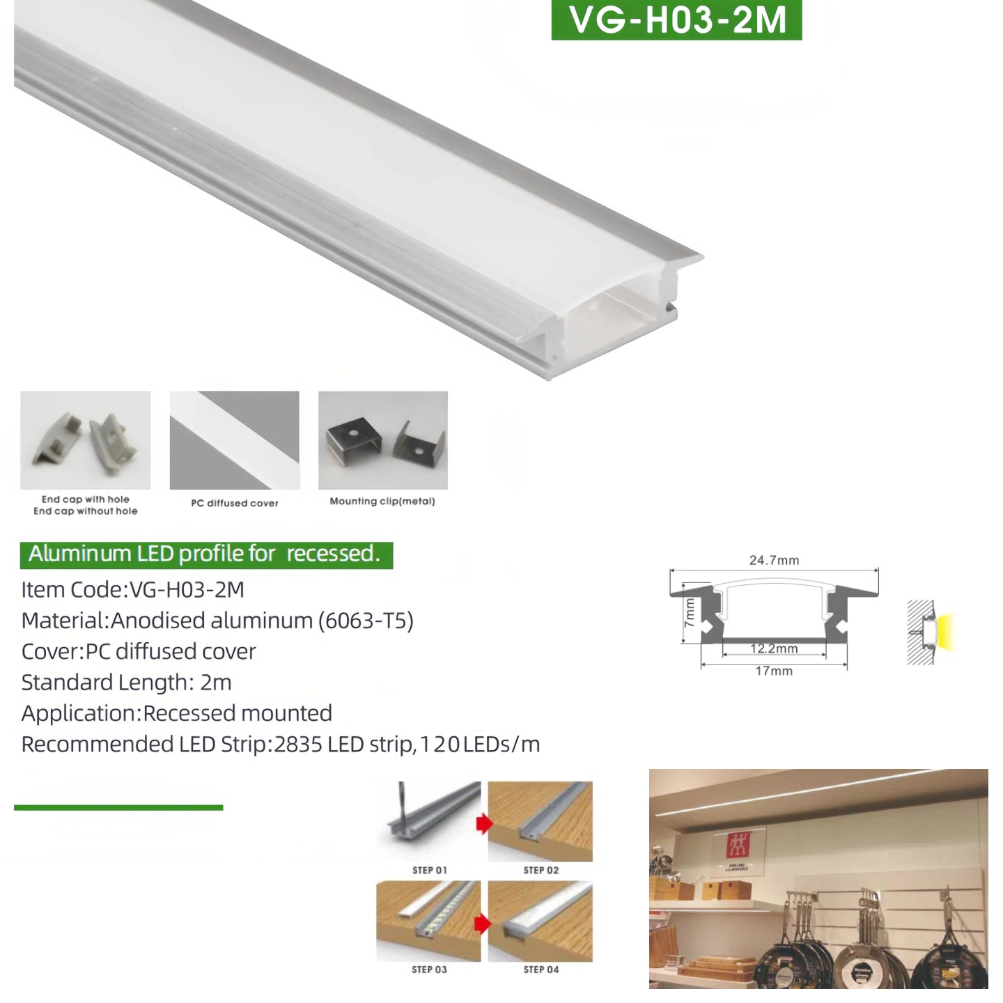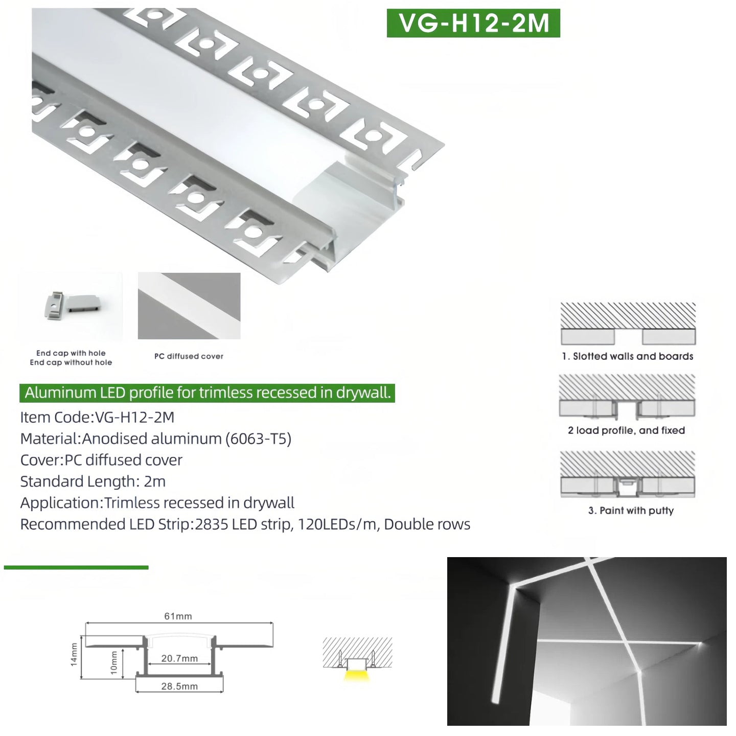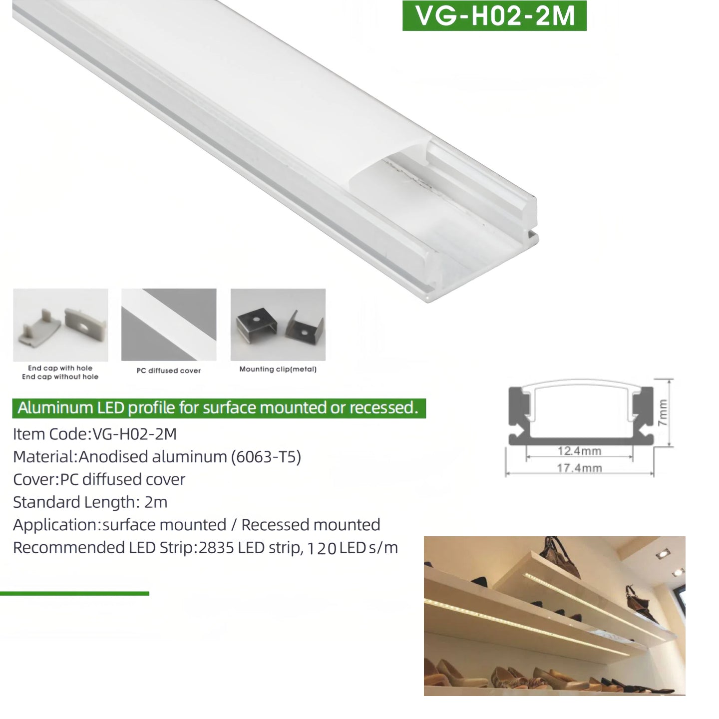 شريط ألومنيوم VG/MODI بطول 2 متر على شكل حرف U مع غطاء أبيض حليبي، وأغطية طرفية، ومسامير، وسلم تثبيت، وسقف، ومشابك تعليق، ومسار ناشر شريط إضاءة LED أسود للإضاءة أسفل الخزانة وخزانة الملابس والعرض