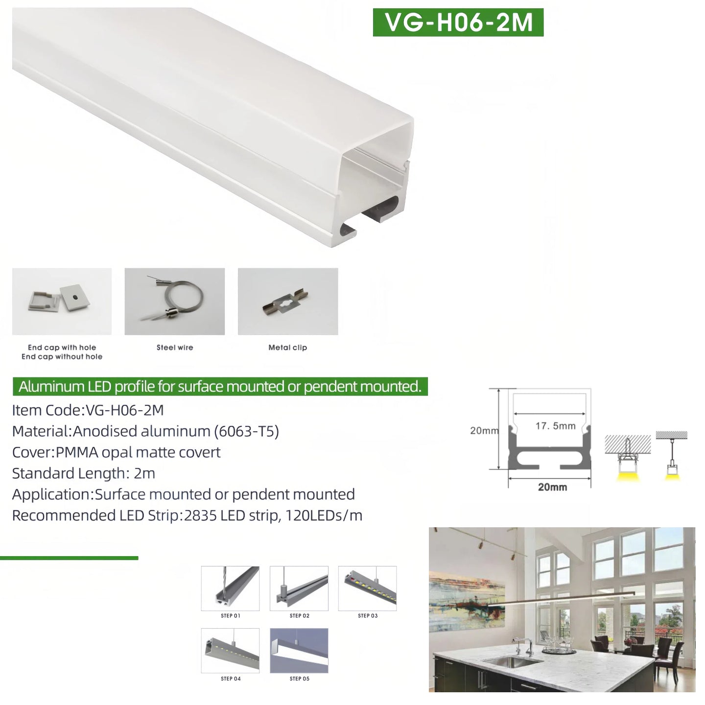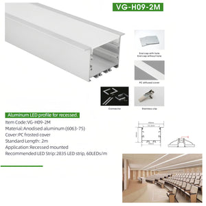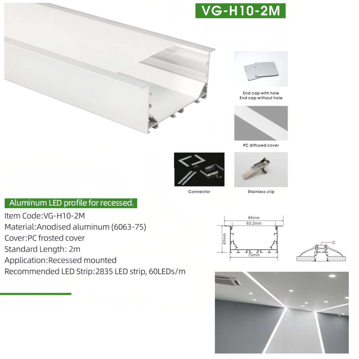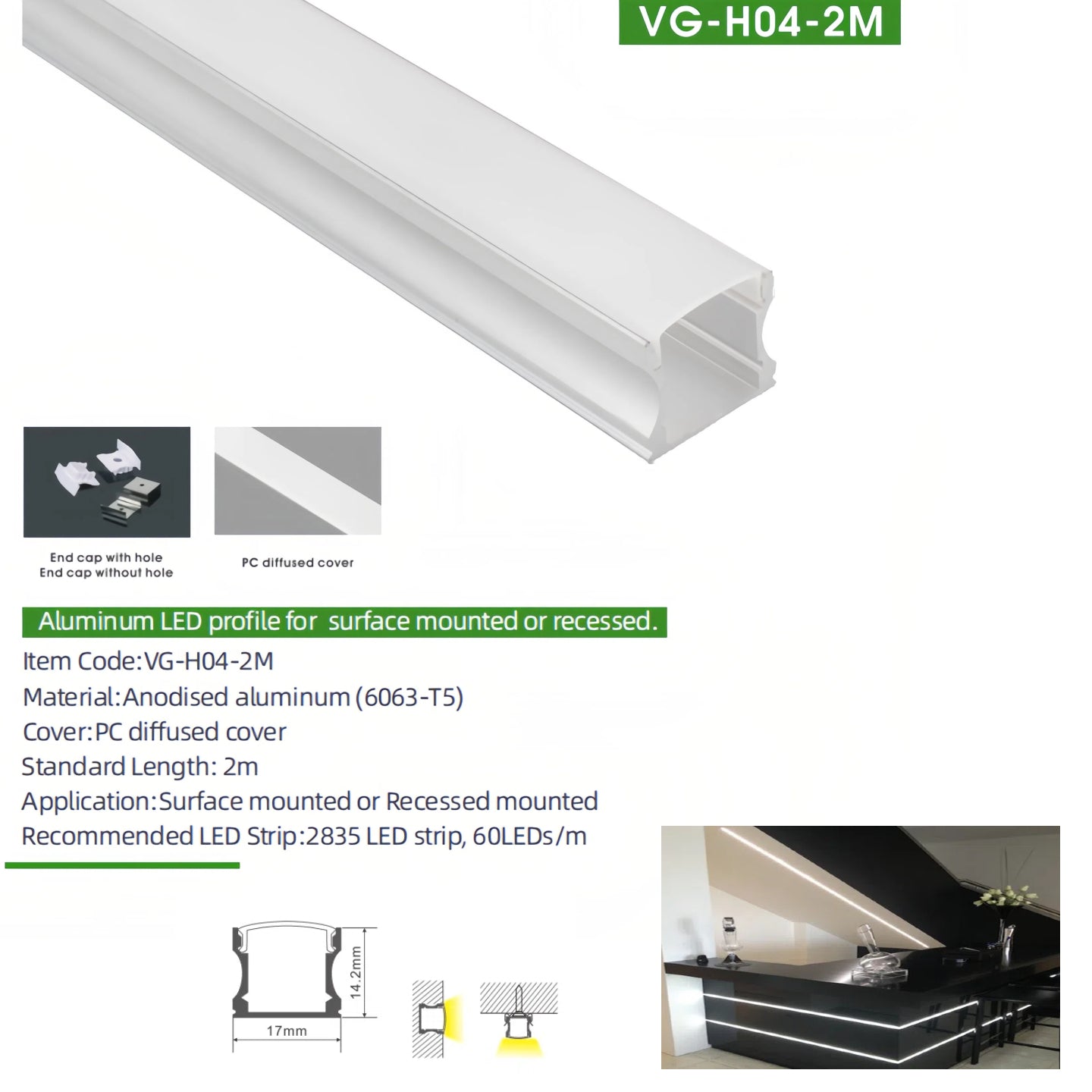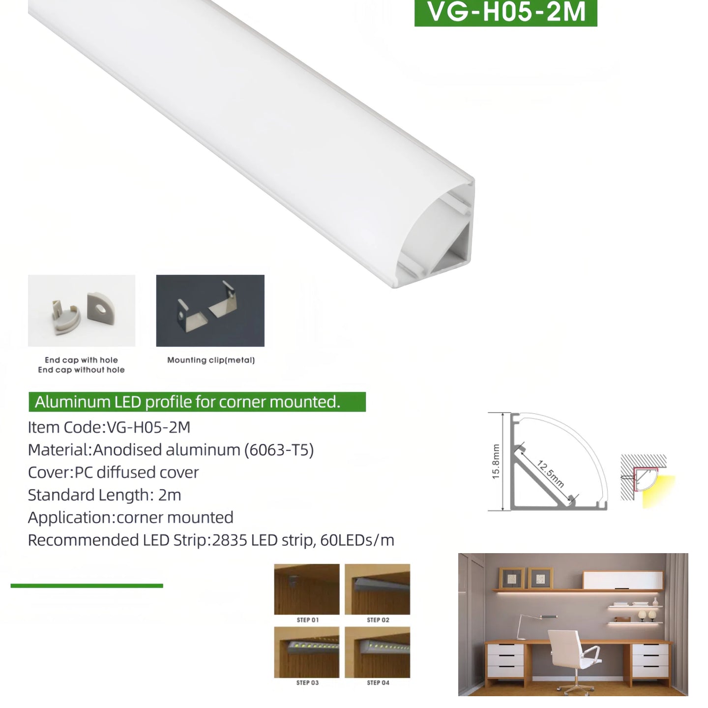 شريط ألومنيوم VG/MODI بطول 2 متر على شكل حرف U مع غطاء أبيض حليبي، وأغطية طرفية، ومسامير، وسلم تثبيت، وسقف، ومشابك تعليق، ومسار ناشر شريط إضاءة LED أسود للإضاءة أسفل الخزانة وخزانة الملابس والعرض